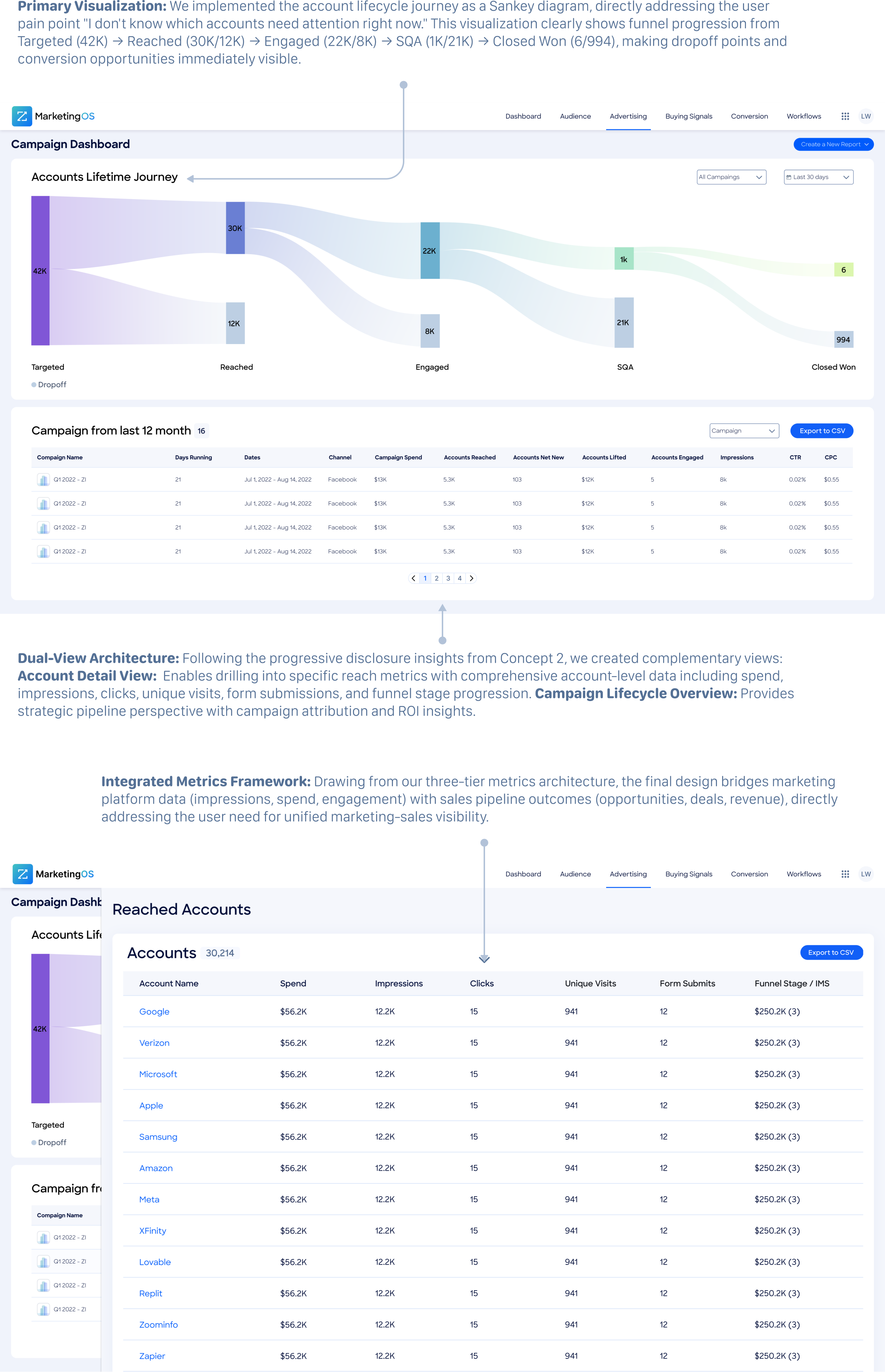 Early Concept Validation with ABM Managers ResultsThe most significant learning was that users conceptualize their work in terms of account journeys rather than isolated metrics. This validated our decision to prioritize the flow visualization over traditional dashboard layouts, confirming that the Sankey diagram addressed their fundamental mental model for understanding campaign effectiveness.
