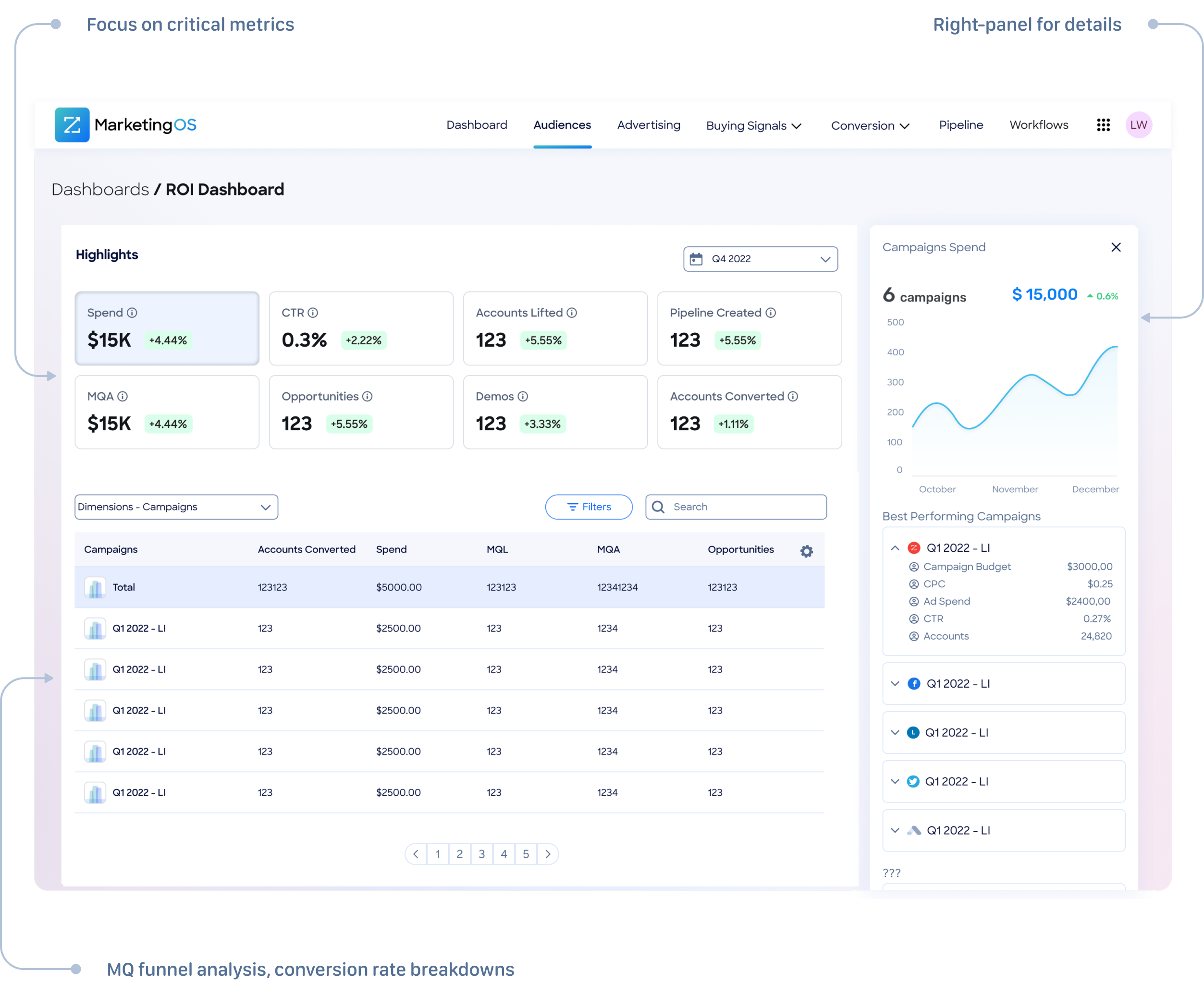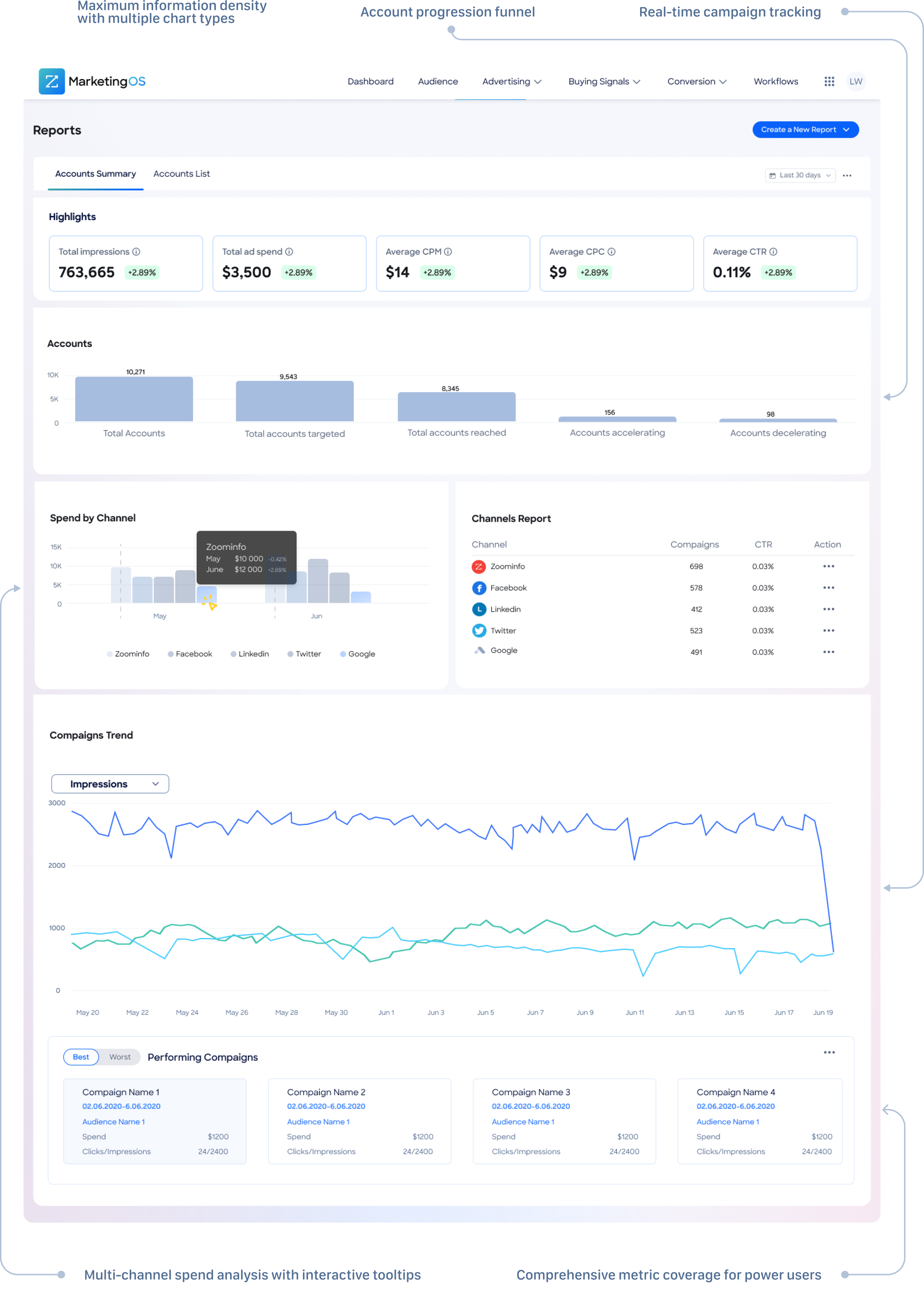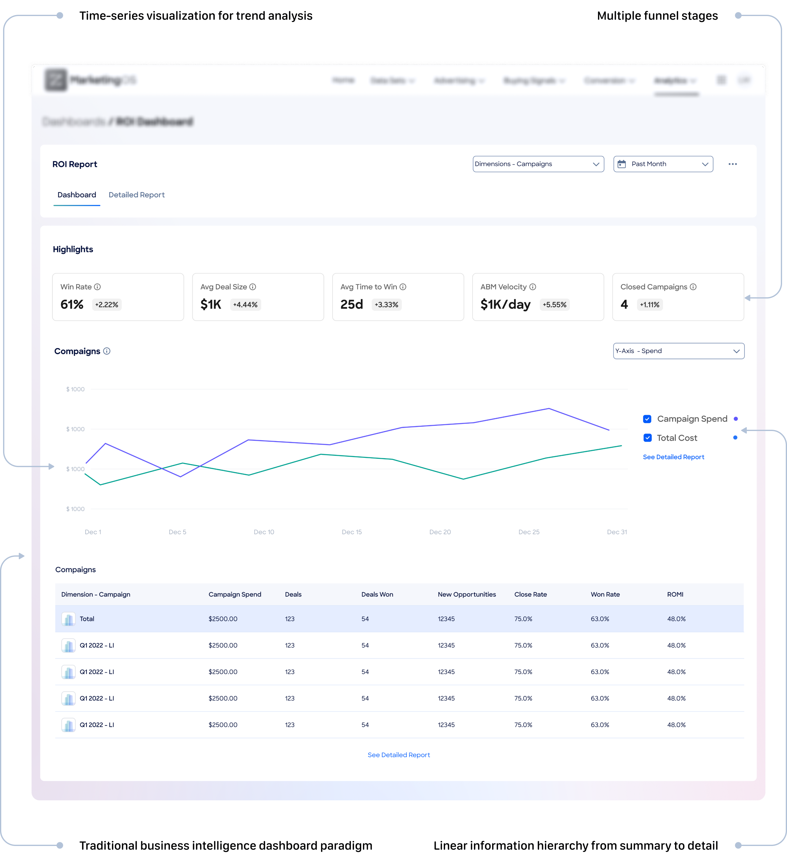 This concept featured highlight cards displaying key performance metrics, followed by timeline-based graphs showing campaign performance trends over time. Below the visual layer, comprehensive data tables provided granular access to detailed metrics.