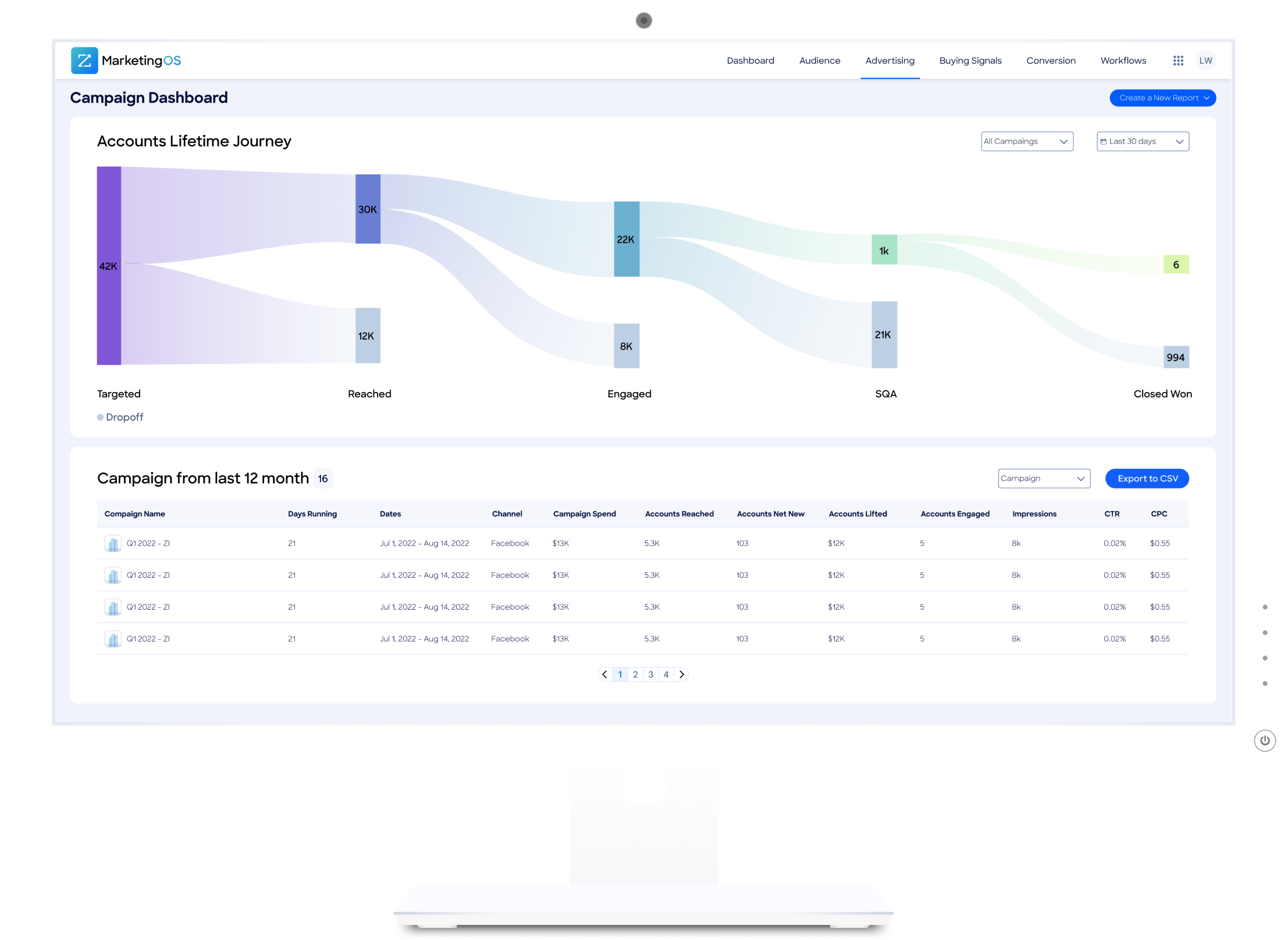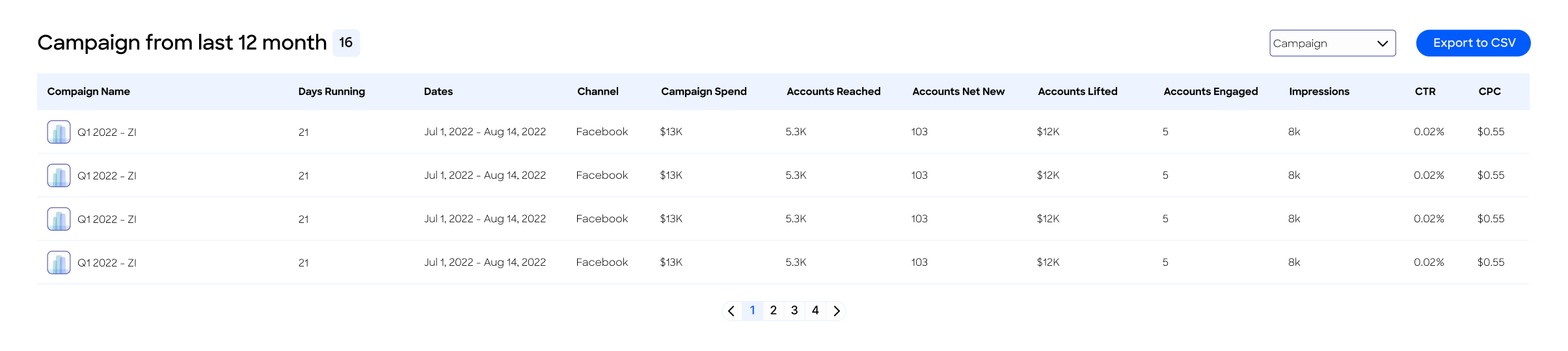 At the bottom of the dashboard, the Campaigns from the past 12 months section provides another view of campaigns for the past 12 months. In this section, user can view metrics per campaign and switch to a monthly view to see a month-by-month breakdown and export the data from this table to a CSV file.